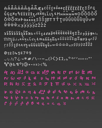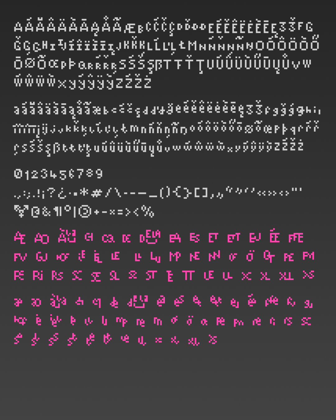 fixelPont is a chaotic pixel font. it comes in two styles, regular and rounded, which align perfectly on top of each other, so that rounded can be used as a colourful backdrop to regular. the design arose out of the need for a fitting typeface for one of the short comics in my masters project. it has a playful vertical rhythm, and a decently sized character set, including ByeByeBinary’s post-binary ligatures for the french language.